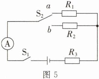 9. 在图5所示的电路中,电源电压恒定,$R_{1}= 6\ \Omega$,$R_{2}= 12\ \Omega$,$R_{3}$是定值电阻。闭合开关$S_{1}$,单刀双掷开关$S_{2}$接a时电流表的示数为1 A,接b时电流表的示数为0.6 A。下列说法正确的是(