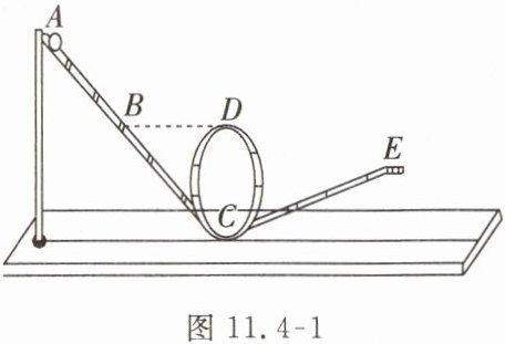 3. 过山车是同学们比较喜欢的游乐项目,图11.4-1是过山车的简易模型。小芳把钢球从斜轨A处由静止释放,钢球到达轨道最低点C处后,然后沿竖直平面内的圆形轨道运动完一圈,再爬上斜轨到达E处并恰好静止。