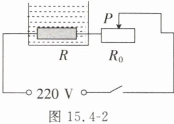 5. 图15.4-2是一种可调温式电热水器的工作原理图。电热水器的工作电压为220 V,电热管$R$的阻值恒为44 Ω,可调电阻器$R_{0}$的阻值范围是0~176 Ω。