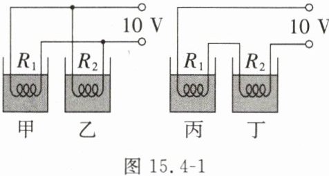 4. 如图15.4-1所示,甲、乙、丙、丁四个相同容器里装有质量和初温相同的水,先后将两个电阻$R_{1}和R_{2}$以并联和串联的方式分别放入甲、乙、丙、丁容器中,其中$R_{1}>R_{2}$。若通电相同时间,则这四个容器中的水温从低到高的顺序是(