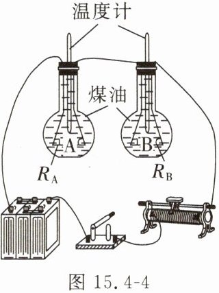 7. 小明和小华为了探究电流通过导体产生的热量与电阻的关系,设计了图15.4-4所示的实验装置。两个烧瓶A、B中盛有质量、初温相等的煤油,$R_{A}与R_{B}$是阻值不同的电热丝。