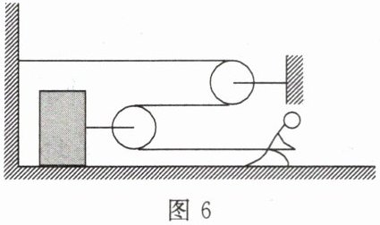 10. 图6是搬运工人用滑轮组将仓库中的货物沿水平轨道拉出的示意图。已知货物的质量为600 kg,所受轨道的摩擦力为其重力的$\frac{1}{10}$,滑轮组的机械效率为75%,g取10 N/kg。若人以0.6 m/s的速度匀速前行,经100 s将货物拉出仓库。关于人拉货物的过程,下列分析正确的是(