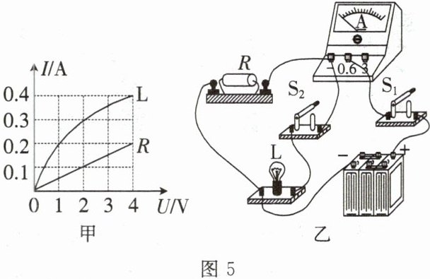 7. 图5甲是小灯泡L和电阻R的电流随电压变化的图像,将它们按图5乙所示接入电路中。当闭合开关$S_{1}和S_{2}$时,小灯泡的实际功率为1.6 W,则电源电压$U= $