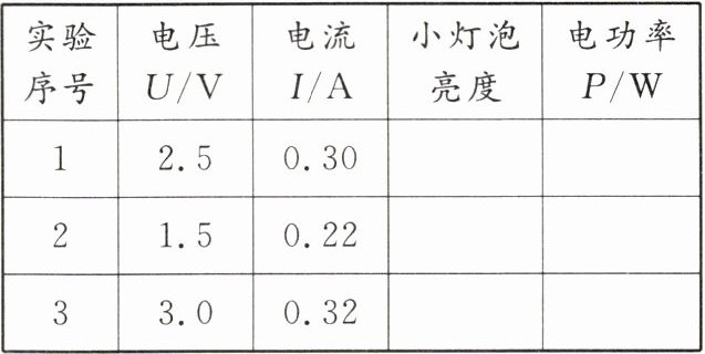 |实验序号|电压U/V|电流I/A|小灯泡亮度|电功率P/W|