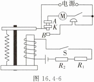 7. 电梯设置了超载自动报警系统,其工作原理如图16.4-6所示,电梯厢底层装有压敏电阻$R_1,R_2$为保护电阻,K为动触点,A、B为静触点。当出现超载情况时,电铃将发出警报声,电梯停止运行。下列说法正确的是(