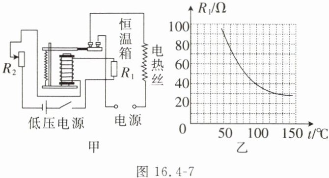 8. 如图16.4-7甲所示,某恒温箱的加热电路由电源、电热丝等组成,其电路通断由控制电路控制,控制电路由电磁继电器、热敏电阻$R_1($安装在恒温箱内)、滑动电阻器$R_2、$低压电源、开关等组成。$R_1$的阻值随温度变化的关系如图乙所示。调节滑动电阻器使得$R_2= 110 Ω,$闭合开关,当恒温箱内温度升高到50 ℃时,由于电磁继电器的作用,加热电路被断开。电磁继电器的线圈的电阻忽略不计。