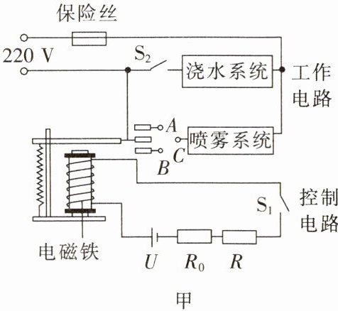 (2)随着花棚内空气湿度减小,控制电路中的电流会_________(选填“变大”“变小”或“不变”)。图1甲中喷雾系统的C点应连接_________(选填“A”或“B”)点,浇水系统和喷雾系统的连接方式是_________联。