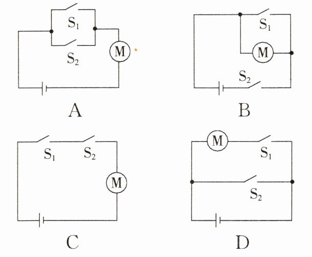 2. 小坤同学为刚种植的树苗设计了自动浇水电路,该电路中的光控开关$S_1$在天黑时自动闭合,湿敏开关$S_2$在土壤过于干燥时自动闭合。当天黑且土壤过于干燥时,电动机开始工作,自动对树苗进行浇水。下列电路中符合上述要求的是(