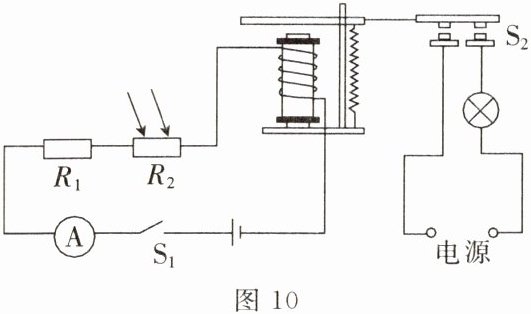 10. 小区内的路灯能根据光线亮暗情况实现自动控制,其原理如图10所示$,R_1$是定值电阻$,R_2$是光敏电阻,其阻值大小随光照强度的增大而减小。当开关$S_1$闭合,光线变暗时,下列判断正确的是(