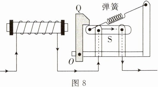 8. 小张同学想知道家里空气开关的限流装置是如何工作的,他阅读说明书,发现了如图8所示的限流装置的工作原理图。S为开关,Q为可绕O点旋转的衔铁,当电流流向如图所示时,电磁铁左端为