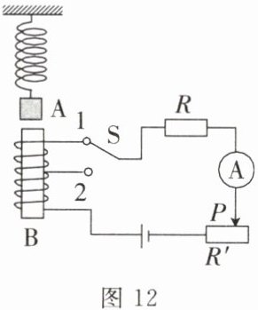 14. 小训利用如图12所示装置探究影响电磁铁磁性强弱的因素,A是铁块,B是电磁铁,R是定值电阻,R'是滑动变阻器。