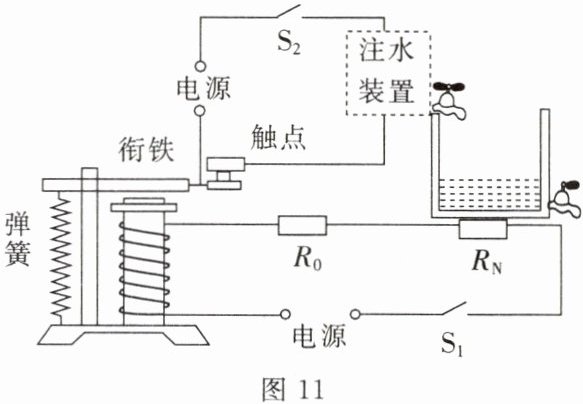 11. 创新小组的同学们为学校食堂设计了一个可自动注水的储水池。图11是它的简化装置图,电源电压一定。控制电路中,Rₙ为压敏电阻,其阻值随压力的变化而变化,R₀为定值电阻。闭合开关$S_1、$$S_2,$当池中水位上升到一定高度时,触点分离,工作电路断开,注水装置自动停止注水;当池中水位下降到一定位置时,触点连接,工作电路接通,注水装置开始注水。下列分析正确的是(