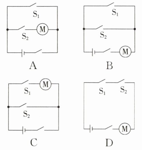 有力的作用。(3)两刹车手柄中各有一个开关$S_1$和$S_2,$在行驶中用任意一只手柄刹车时,该手柄上的开关都立即断开,电动机停止工作。以下电路符合要求的是