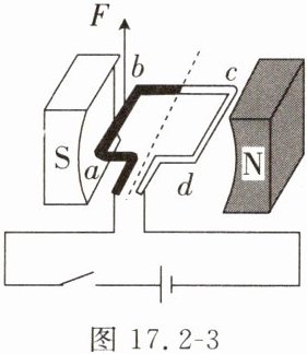 5. 如图 17.2-3 所示,线圈 abcd 位于磁场中,当开关接通时,ab 段导线受到磁场力 F 的方向向上。此时,cd 段导线受到的磁场力(