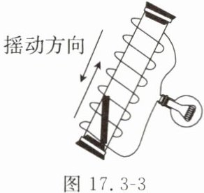4. 小明自制了图17.3-3所示的实验装置,将带绝缘层的导线绕在塑料管外,导线两端连接着小灯泡,形成闭合电路,管内封闭一个强磁体。沿图中所示方向来回快速摇动装置,小灯泡