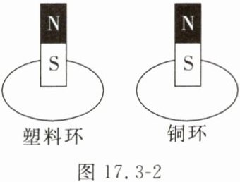 3. 如图17.3-2所示,条形磁铁从相同高度自由下落,分别穿过闭合的塑料环和铜环。磁铁刚穿过铜环时的机械能比刚穿过塑料环时的机械能小,原因是磁铁在穿过铜环时发生了