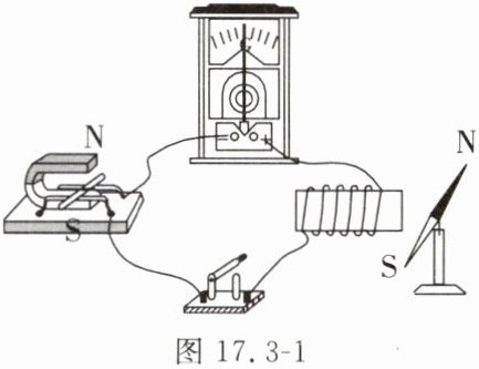 2. 在水平桌面上按照图17.3-1所示装置进行实验,闭合开关,使铜棒在水平金属轨道上快速左右运动,观察到灵敏电流计的指针发生偏转,这一现象与