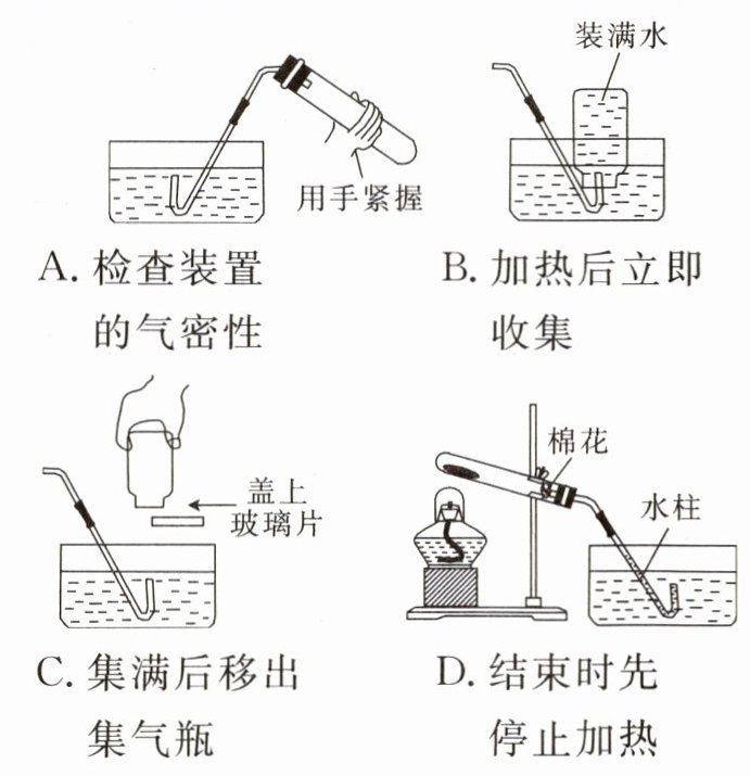 D选项,结束时先停止加热,会使试管内温度降低,压强减小,水槽中的水倒吸入试管,使试管炸裂,应先移出导管再停止加热,操作错误。