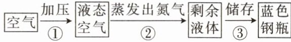 ) 空气→加压→液态空气→蒸发氮气→剩余液体→储存→蓝色钢瓶