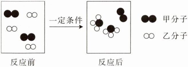 反应前有两种分子(甲分子和乙分子),反应后有一种新分子和剩余的甲分子,生成一种物质,A错误;