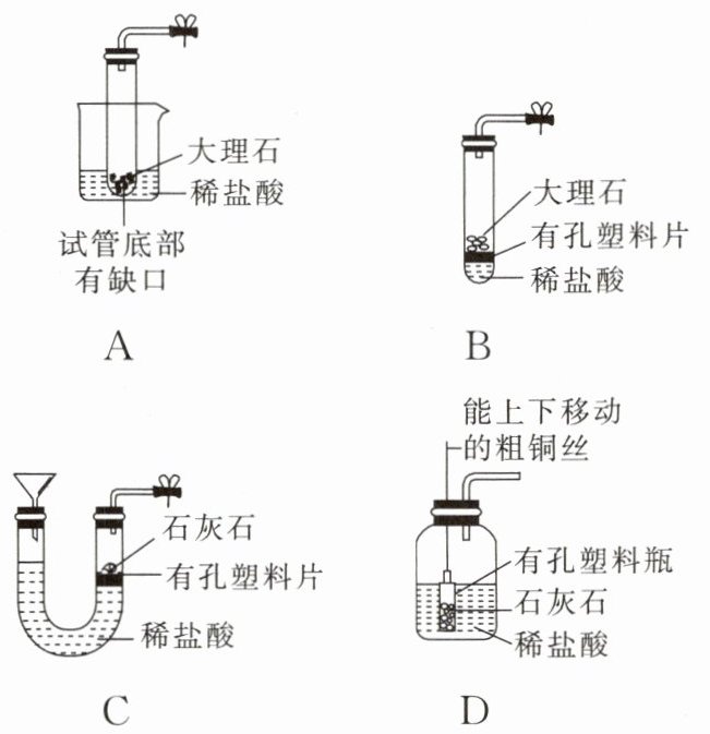 D.能上下移动的粗铜丝 有孔塑料瓶 石灰石 稀盐酸