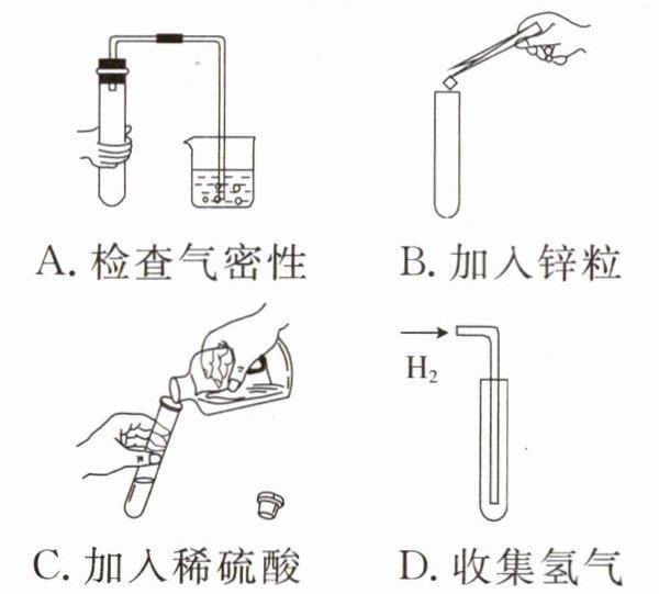 D选项,氢气密度比空气小,应用向下排空气法收集,图中为向上排空气法,操作错误。