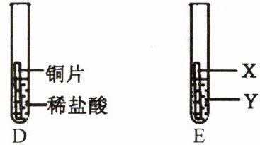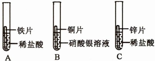 10. 某研究小组为验证铁、铜、锌、银的金属活动性顺序,设计下图所示三个实验(三种金属均已用砂纸打磨过,其形状和大小相同,稀盐酸的浓度和质量也相同)。