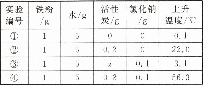 小组同学称取一定量的铁粉、活性炭、氯化钠等物质,分别加入盛有一定体积水的烧杯中,用温度计测量烧杯内温度的变化,实验数据记录如下表所示。