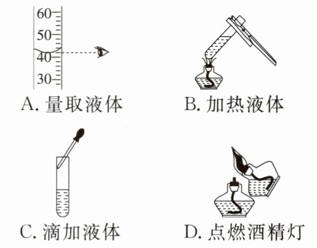 D.点燃酒精灯时,应用火柴点燃,不能用燃着的酒精灯去引燃另一只酒精灯,图中操作错误。