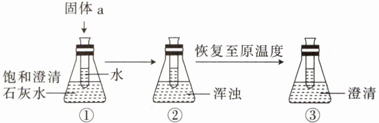 解:A. 氢氧化钙溶解度随温度升高而减小,加入固体a后溶液变浑浊,说明温度升高,硝酸铵溶于水吸热,温度降低,A错误。