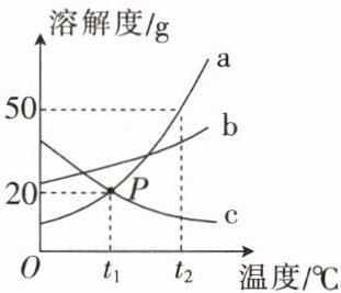 (1)在$t_1℃$时,a、c两种物质的溶解度相等,均为20g。