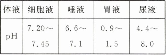 7. 健康人的体液必须维持在一定的`pH`范围内。人体内一些体液的正常`pH`测试数据范围如下表所示。下列根据表格信息所得结论正确的是(