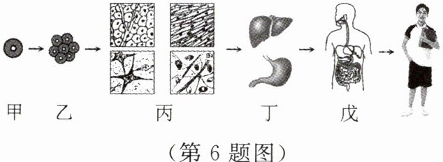 6. 你从一个受精卵发育成长为一个健康的青少年,让我们看到了生命的奇妙变化。人体的结构层次如图所示,请据图完成下列习题。