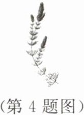 4. 金鱼藻(见右下图)是一种常见的水生生物。它在水下开花,雄花成熟后,花药能上升到水面,并开裂散放出花粉,花粉慢慢下沉到达水下雌花的柱头上,受精后发育成果实。金鱼藻是(