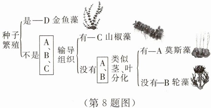 8. 鱼缸造景是在热带鱼饲养与种植水草的基础上新兴起来的一项艺术,被称为“玻璃后面的艺术”。在造景过程中,金鱼藻、莫斯藻、轮藻、山椒藻等水草都是常用的造景生物。下图为这四种生物的分类图,请据图完成下列习题。