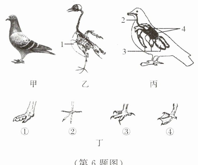 6. 生态环境好不好,鸟儿用翅膀来投票。野生鸟类对环境变化十分敏感,因此鸟儿被称为生态环境的“晴雨表”和“监考官”。它们有许多适于飞行的形态结构特点,图甲、乙、丙分别为家鸽外形、骨骼、呼吸系统的示意图,图丁表示形态各异的鸟趾。请据图完成下列习题。