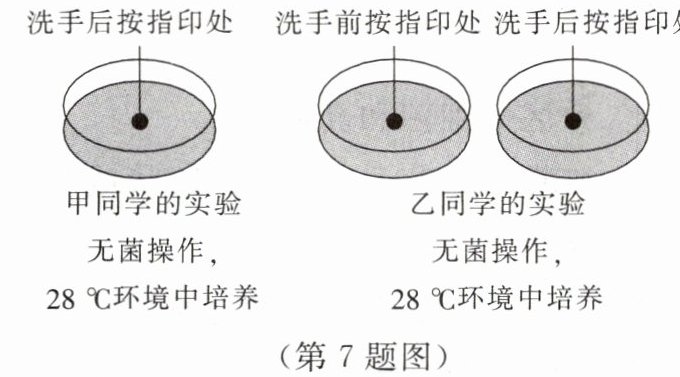 (2)由图可知,乙同学的实验中,除了洗手前按指印和洗手后按指印这个条件不同外,其他条件都相同,因此该实验的变量是洗手前、后按指印处的细菌数量。