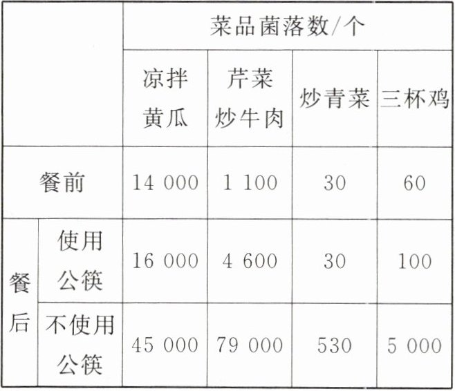 (2)实验中,将每道菜平均分成两份,一份使用公筷,一份不使用公筷,这样操作的目的是设置______。