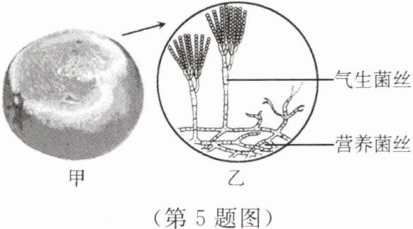 5. 小明外出多日,发现遗留在桌子上的橘子表面长出了“霉斑”,请你与他一起对“霉斑”进行探究,并完成下列习题。