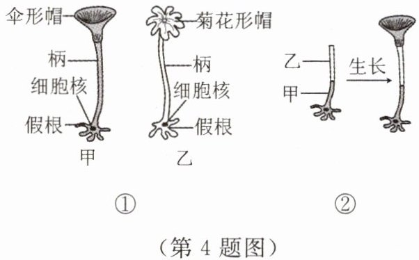 (2)在该实验中,将甲伞藻的帽和柄都切除,然后把乙伞藻的柄移植到甲伞藻的假根上,结果长出的新帽形状与甲相同。因为细胞核位于假根中,这就表明伞藻的遗传是由细胞核控制的,而不是细胞质控制的。