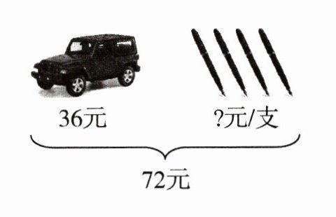 解析:考查减法的应用,从图中可知一辆玩具车$36$元,要求每支笔的价格,用总价钱减去玩具车的价钱,再除以笔的数量。
