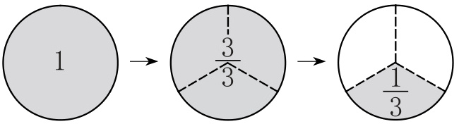 文字说明:1可以看作3个$\frac{1}{3}$,就是$\frac{3}{3}$。$\frac{3}{3}$减$\frac{2}{3}$等于$\frac{1}{3}$。