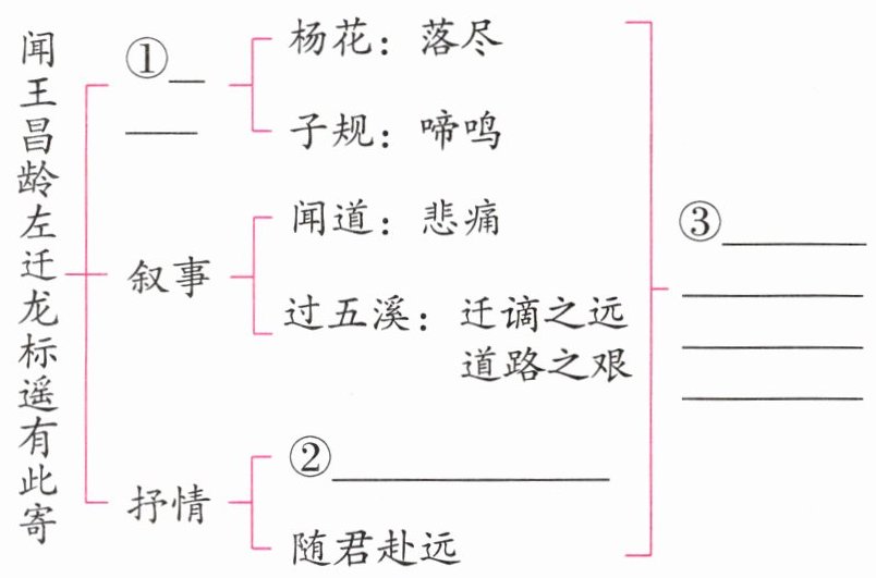 2. 诗歌前两句中,“_________”即柳絮,写景的同时点明时令,表现出_________之感;“_________”即杜鹃,它的鸣叫声凄切,表现出浓郁的离愁别恨,表达了诗人对友人的深切关怀之情。