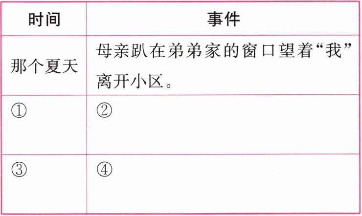 3. 本文叙述了母亲注视着“我”背影的三件事,请你按照时间顺序,用概括的语言补充下面表格。