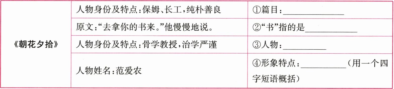|《朝花夕拾》|人物身份及特点:保姆、长工,纯朴善良|①篇目:____|