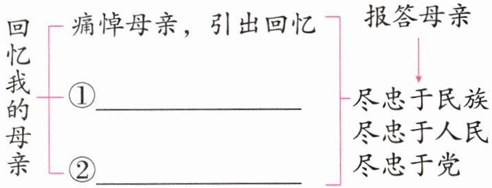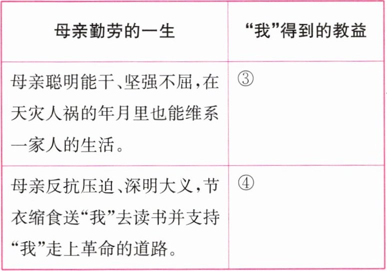 |母亲反抗压迫、深明大义,节衣缩食送“我”去读书并支持“我”走上革命的道路。|④|