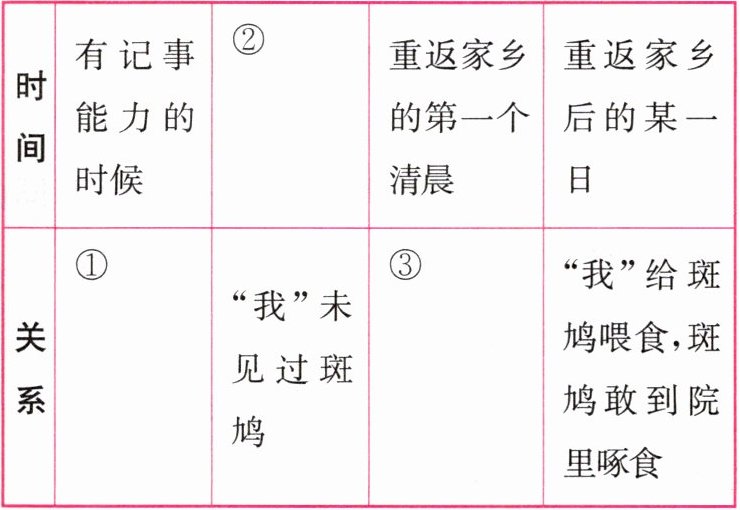 |关系|①|“我”未见过斑鸠|③|“我”给斑鸠喂食,斑鸠敢到院里啄食|