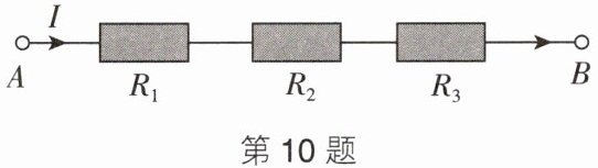 10. 如图,把 $ R_{1} $,$ R_{2} $,$ R_{3} $ 三个电阻串联起来,线路 $ AB $ 上的电流为 $ I $,电压为 $ U $,则 $ U = IR_{1} + IR_{2} + IR_{3} $。当 $ R_{1} = 19.7 $,$ R_{2} = 32.4 $,$ R_{3} = 35.9 $,$ I = 2.5 $ 时,则 $ U $ 的值为