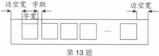 13. 如图,初三年级准备制作一个长8.5m的横幅,横幅内容定为16个字,对横幅的有关数据作如下规定:每个字的字宽是相同的,每两个字之间的字距均相等,边空宽:字宽:字距$=3:4:1$,试求横幅字距是多少?