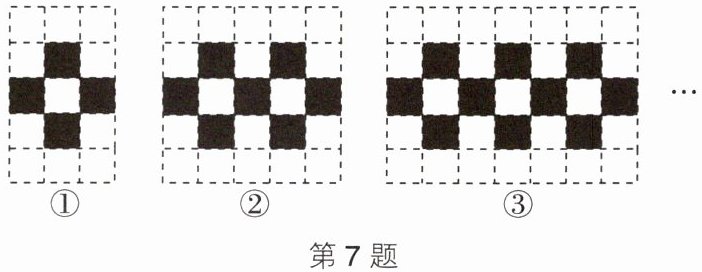 (3)如果白色方块的个数能比黑色方块的个数多2024,则10n+5-(3n+1)-(3n+1)=2024,解得$n=\frac{2021}{4},$因为n为正整数,所以白色方块的个数不能比黑色方块的个数多2024。